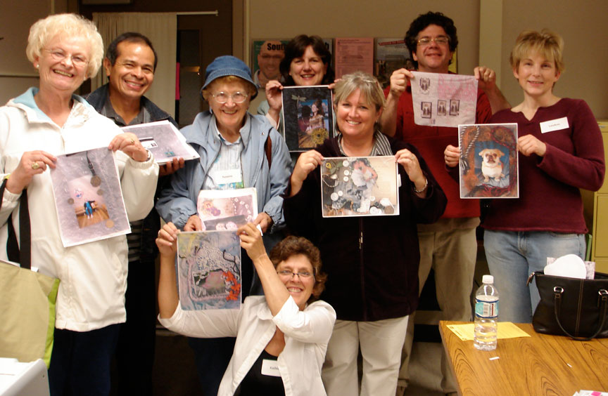 The morning session covered the basics of digital printing, elements of digital design, and printing fabric sheets. Informational take-home handout material was provided so we'd have more time for hands-on. Students were divided into groups to design and print a creative collage fabric sheet which was used during the afternoon session.