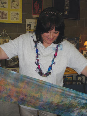 silk scarf in class. Val demonstrated the COLORHUE/shaving cream technique which the students used along with some Jacquard Lumiere paint to add some shimmer
