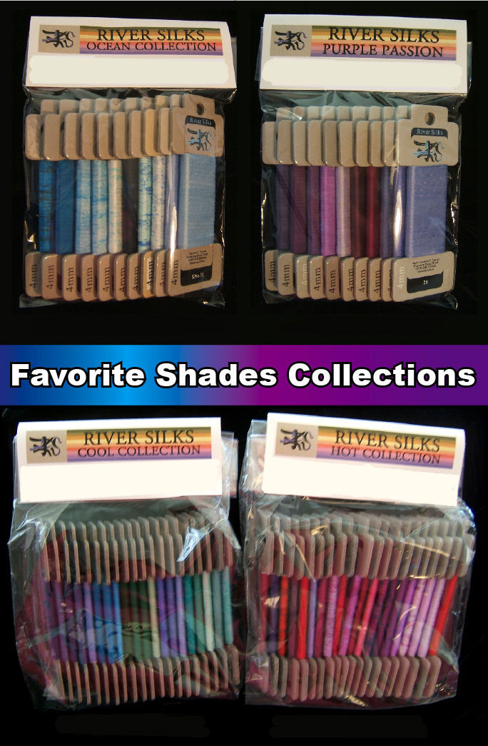 River Silks manufactures premium 100% silk ribbon. The silk ribbon is woven to strict specifications and hand dyed in Suzhou, China, the ancient capital of the Silk Road. In addition to the collections, individual spools of over 280 stunning colors in solid colors and over dyes in widths of 4mm and 7mm are available by drop ship order.   Just email us and tell us what you want!   If you like a wider width, there are over 85 colors in the 13 mm silk ribbon. The ribbon is woven as ribbon and has a barely perceptible selvedge which gives them incredible durability. Needlepointers can stitch with lengths of 4-6 feet without any fraying. Quilters can sew through the ribbon without any running. Those favoring crazy quilts marvel at bobbin stitching done with River Silks! To see what colors are in the collections and purchase them, please click on the pictures.